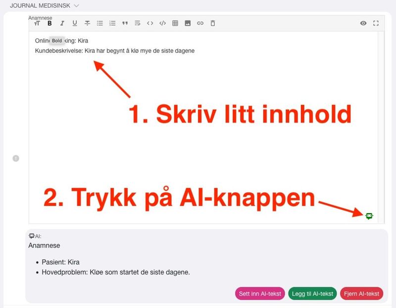 Alle felter i Dyrejournal der AI er tatt i bruk som hjelpeverktøy har man selvsagt muligheten til å forkaste eller redigere det som har kommet som forslag gjennom AI.