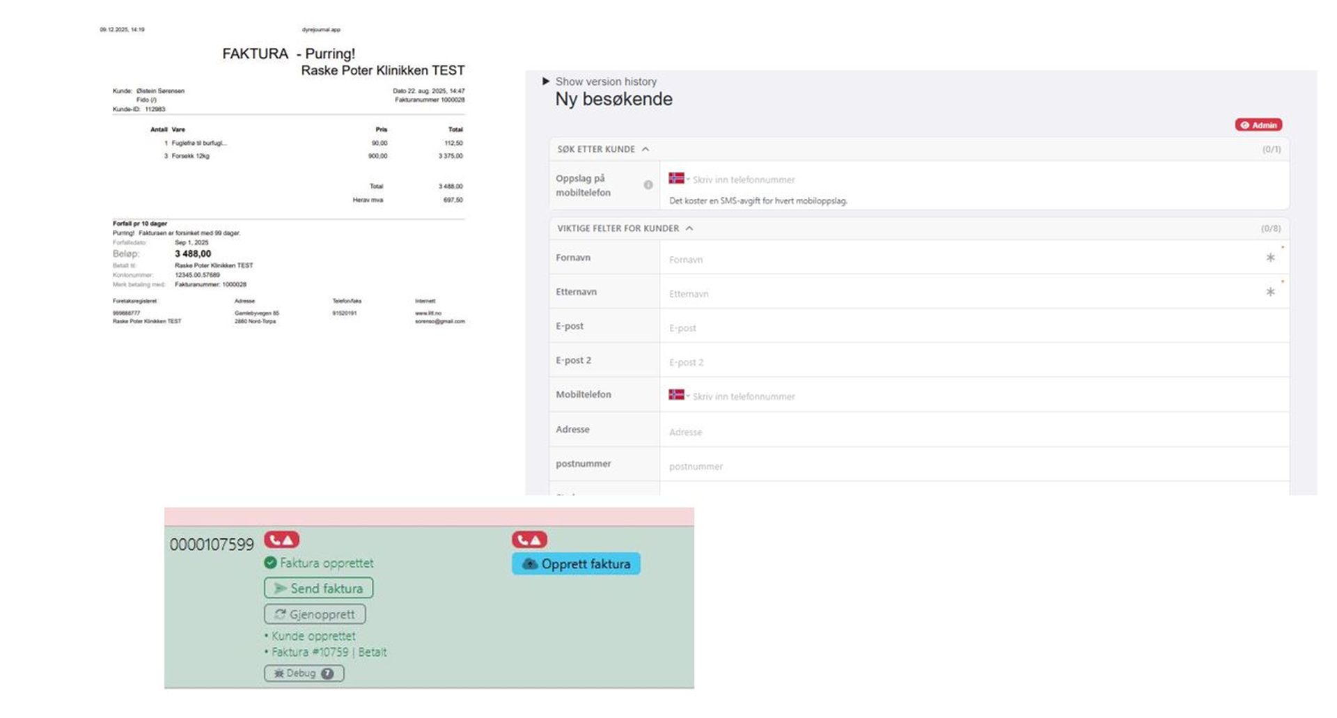 Det jobbes løpende med forbedringer ikke bare av funksjonalitet, men også av hvordan skjermbilder, skjemaer og utskrifter ser ut. ###### Nytt i den senere tid er: - Oppdatering av layout på Fiken og Tripletex i besøkslisten. - Oppdatering i skjemalayout på kunder, dyr og produkter. - Bedre formatering av utskrift av faktura, restfaktura, purring og kreditnota. Ta kontakt med oss på [post@dyrejournal.no](mailto:post@dyrejournal.no) hvis du har tanker om forbedring av design og layout.